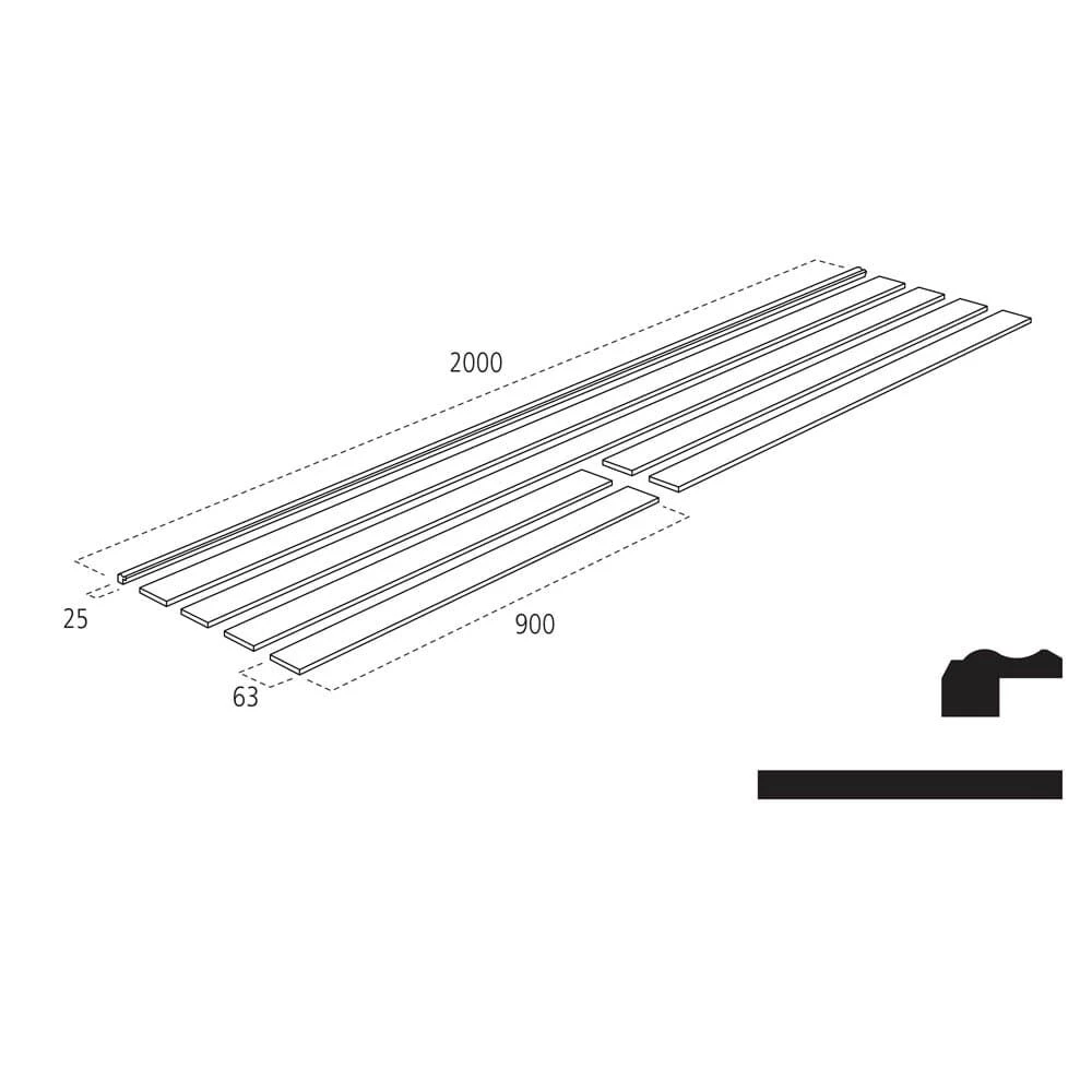 Each Kit contains 1 x 2m Decorative Capping Moulding, 2x2m Horizontal Slats and 4x900mm Vertical Slats. Simply prepare the wall and attach with glue, nails or screws.