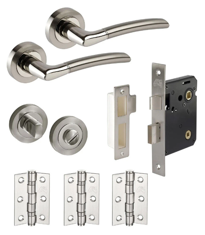Privacy pack includes: a pair of lever handles, 3 x ball bearing hinges, a privacy latch, a bathroom turn and release and strike plate