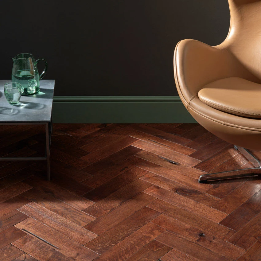 A rich, timeworn herringbone with red and auburn undertones which bring warmth and depth to the floor. A striking choice, full of character and charm.