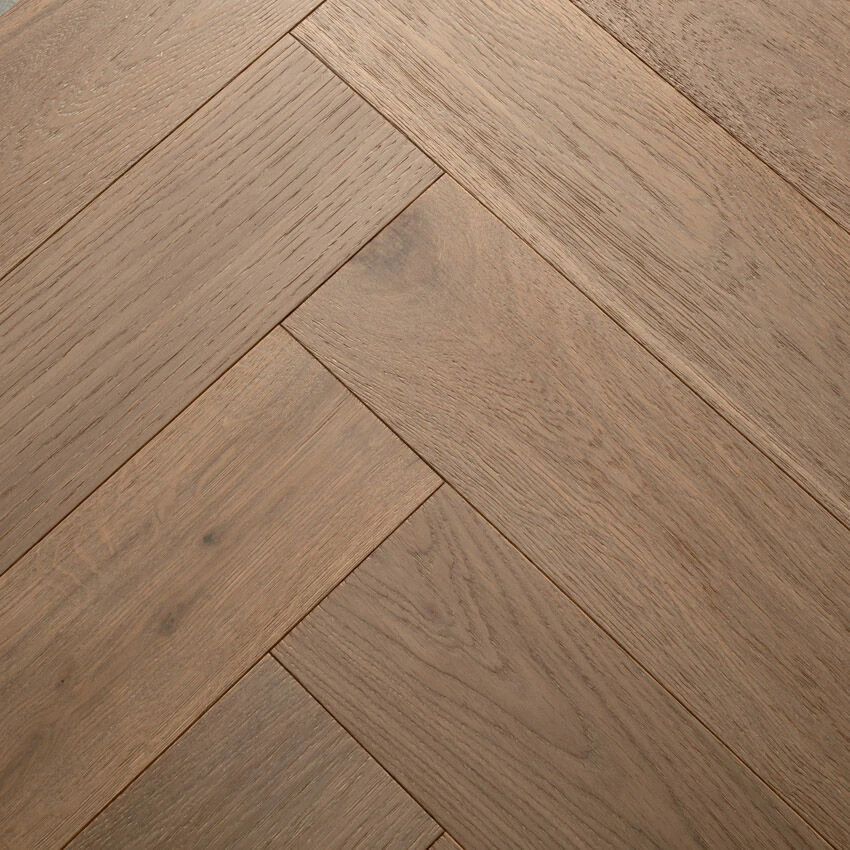 Calm white grains meet soft grey tones, creating a wonderfully clean and contemporary look on this large format herringbone floor, the subtle colour variations further enhanced by smoking.