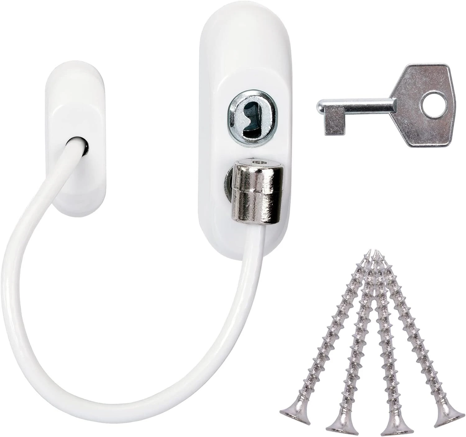 Locking cable restrictor provides up to 150mm of opening (depending on installation). Suitable for domestic or commercial use and supplied with key and fixings.