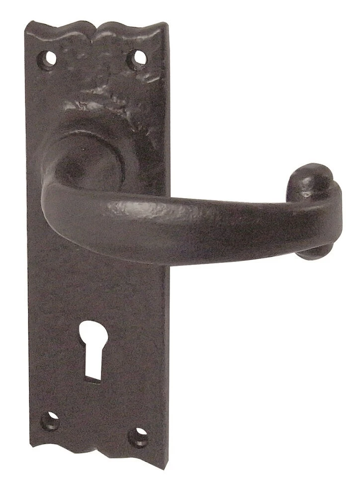 A very high-quality pair of Rustic style sprung door handles with keyholes, in black cast iron complete with all screws and connecting bar.