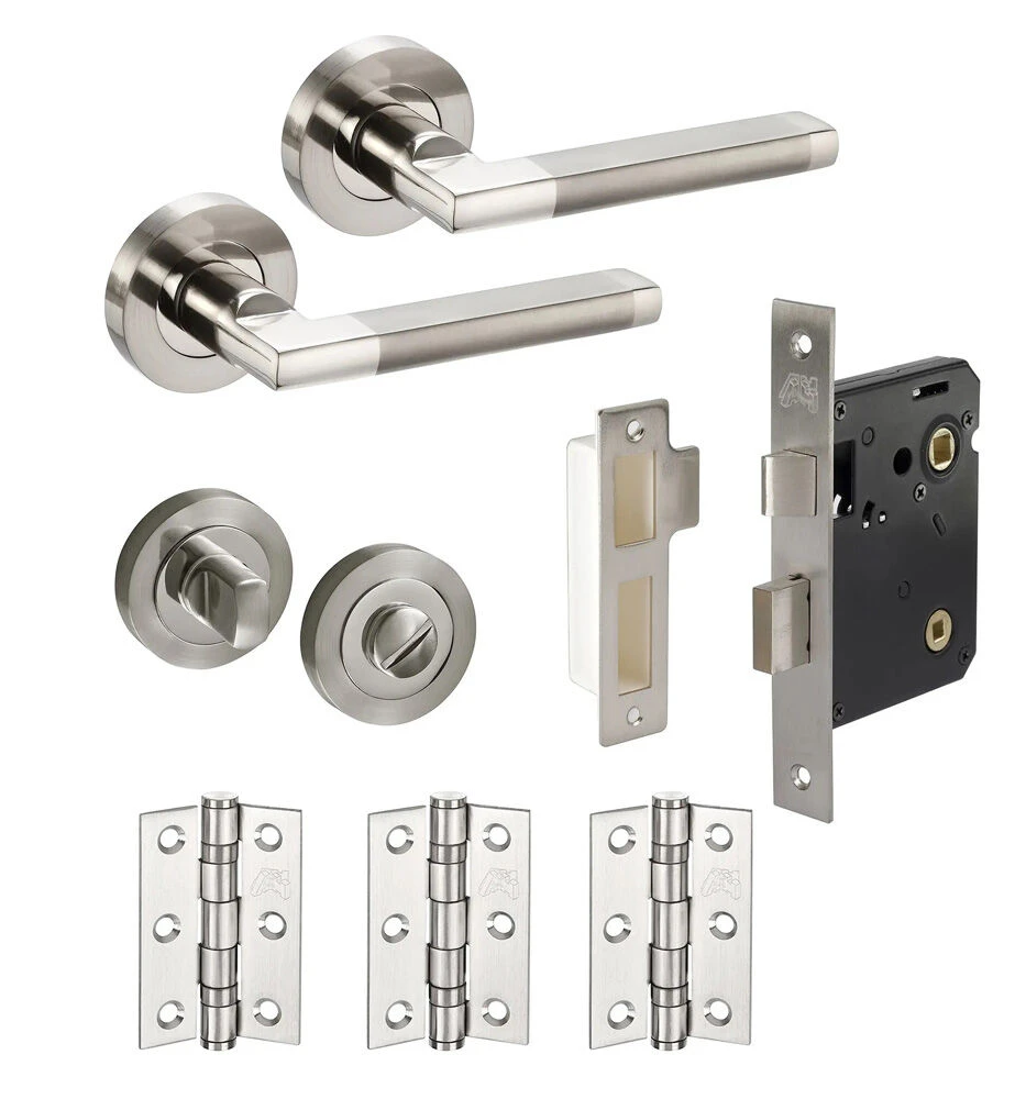 Privacy pack includes: a pair of lever handles, 3 x ball bearing hinges, a privacy latch, a bathroom turn and release and strike plate